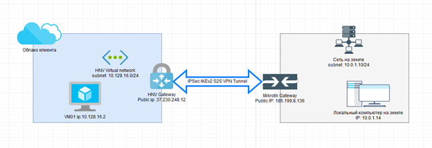 В этой статье рассмотрим построение межсетевого VPN Site-2Site между Микротик на земле и сетью HNV в облаке «Облакотеки».