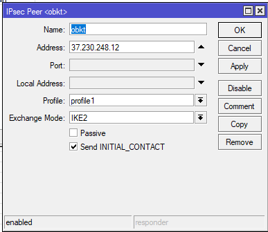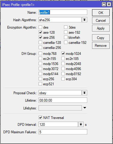 Время жизни Life time указываем 8 часов. DPD Interval (интервал обнаружения залипших, мертвых, пиров) оставляем 120, NAT Traversal устанавливаем в зависимости от того как подключен. Настраиваемый микротик. В нашем случае, раутер находится в серой сети провайдера. Поэтому чекбокс установлен
