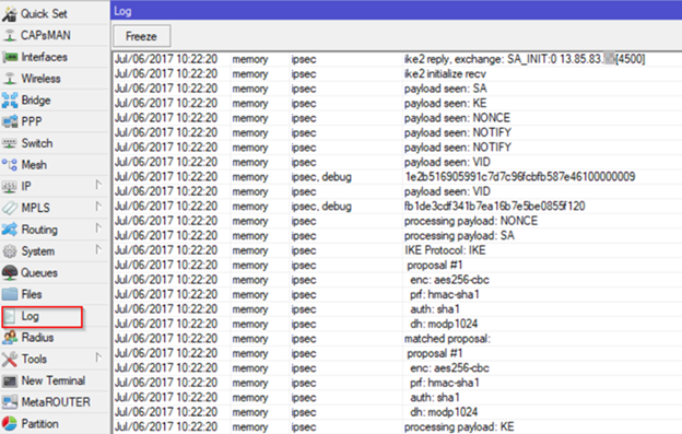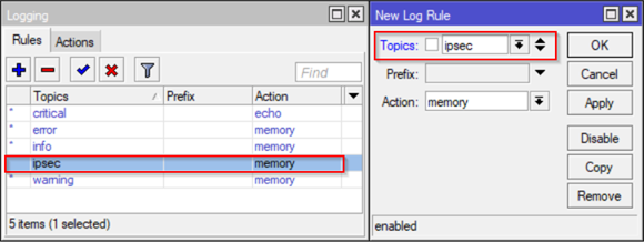 Если что-то не работает по какой-либо причине – можно обратиться к логам для выяснения причин. MikroTik обеспечивает хороший интерфейс для протоколирования и поиска неполадок IPSec. События связанные с IPSec можно визуализировать в меню журнала. Для того, этого в конфигурацию ведения журнала (System Logging) нужно добавить IPSec в качестве темы: