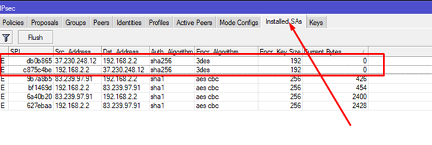 - В окне IPSec, На вкладке Installed SA’s, увидим текущие ассоциации безопасности ля нашего соединения