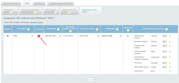 В этом окне мы установили параметры шифрования поддерживаемые HNV сетью «Облакотеки» и указанные в настройках VPN канала выполненных нами ранее, в облаке