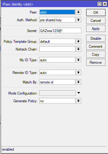 - В Поле Secret - Указываем значение что ввели как секретную фразу PSK в настройках облачного VPN