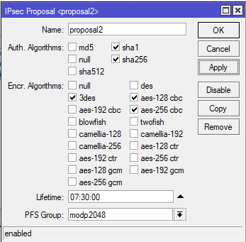 Значения полей для алгоритмов аутентификации и шифрования берем из настроек VPN канала в Облакотеке. Чтобы наши VPN раутеры в облаке и на земле работали согласованно и точно знали какими алгоритмами пользоваться при шифровании и расшифровке данных. Поле LifeTime установим на 7 часов 30 минут.