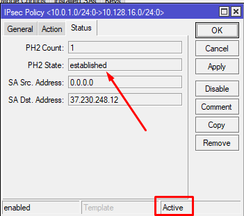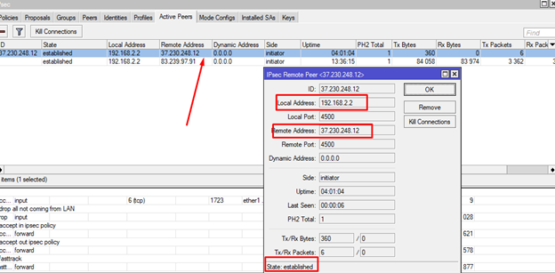 - В окне IPSec, на вкладке Active peers, Увидим наш peer в статусе established с адресами которые мы указывали для земли и для облака.