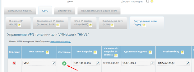 Если всё сделали без ошибок, то все должно заработать сразу. Первый признак что туннель поднят это зелененький флажок на подключении VPN в CP
