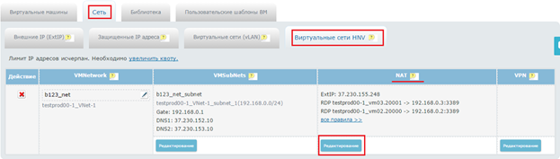 - Если в колонке видите IP-адрес вида 192.168.х.х или 10.х.х.х, то это наверняка адрес HNV. Так же, для доступа к ВМ из мира, в сетях HNV используется публикация портов ВМ с помощью правил NAT. Для протокола RDP применяется порт 3389. Если ВМ создается с сетью HNV, то правило создается автоматически. Так же правила всегда можно посмотреть, если во вкладке Сеть-Виртуальные сети HNV перейти в редактирование правил NAT: