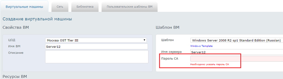 - Для ВМ, созданных из стандартных шаблонов Windows Server облакотеки, используются два логина: Администратор – для русскоязычных ОС Windows и Administrator – для англоязычных ОС. Пароль администратора пользователь указывает в поле «Пароль СА» при создании ВМ: