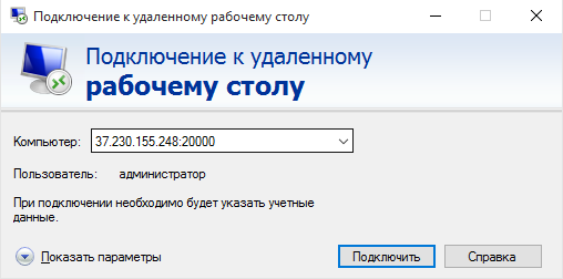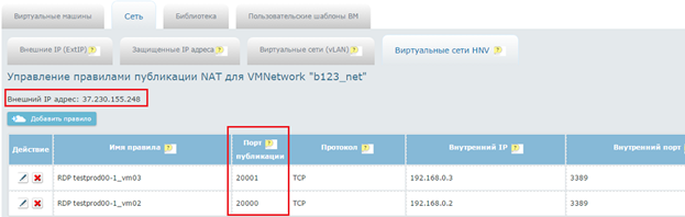 В этом случае, для подключения по RDP для ВМ, у которой используется сеть HNV, адрес подключения будет выглядеть следующим образом: 37.230.155.248:20000
