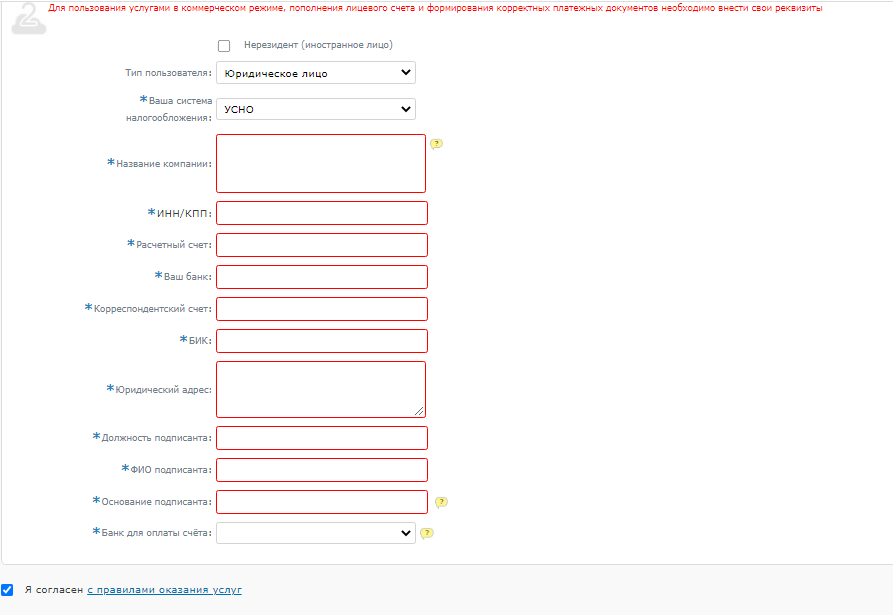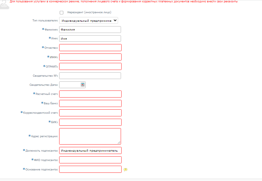 Необходимо выбрать тип пользователя и заполнить обязательные поля.