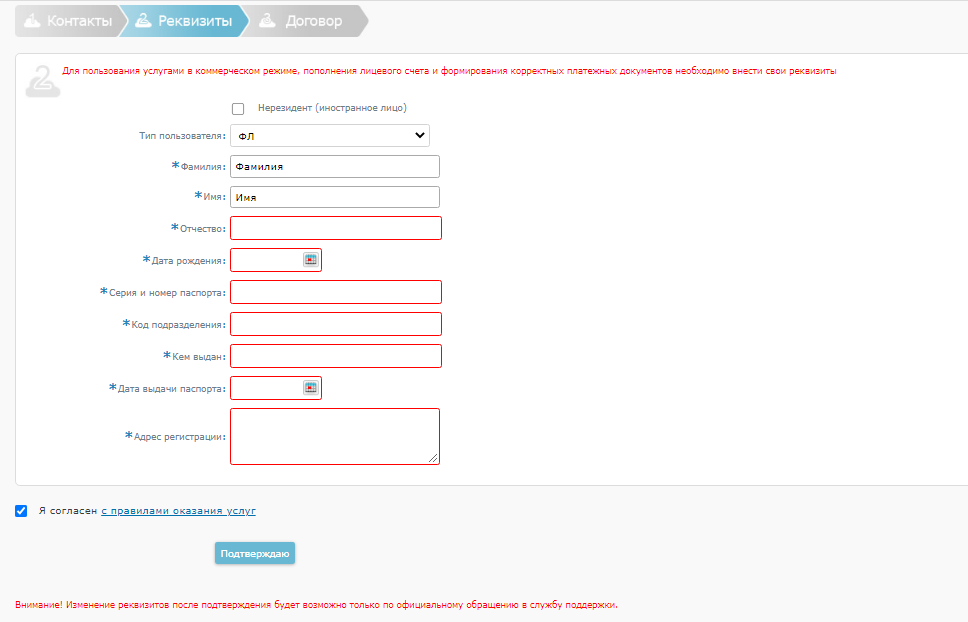 Изменение реквизитов возможно только по официальному обращению в службу поддержки.