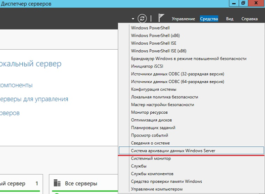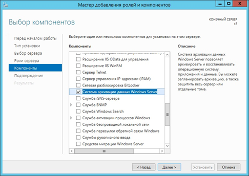 Установка компонента производится из диспетчера сервера, с помощью мастера добавления ролей и компонентов. В разделе компоненты необходимо отметить галочкой «Система архивации данных Windows Server»