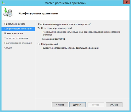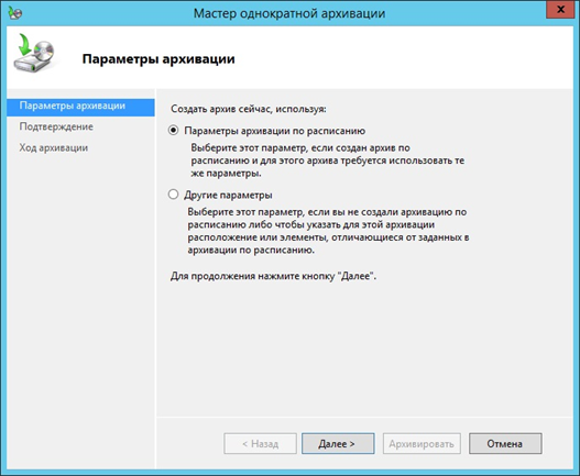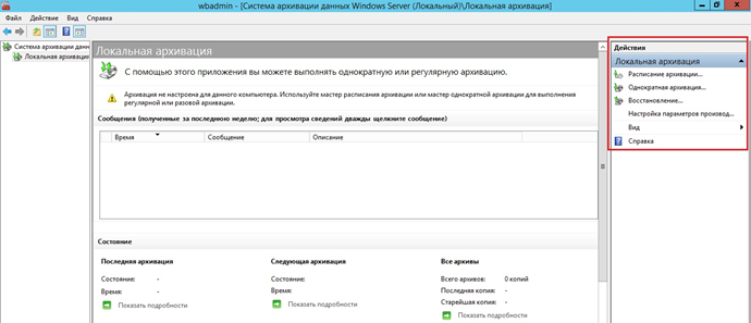 Расписание архивации предназначено для выполнения регулярной архивации в заданное время. Средствами windows есть возможность делать резервную копию как всего сервера, так и отдельных файлов/папок. В примере рассматривается настройка архивации всего сервера.