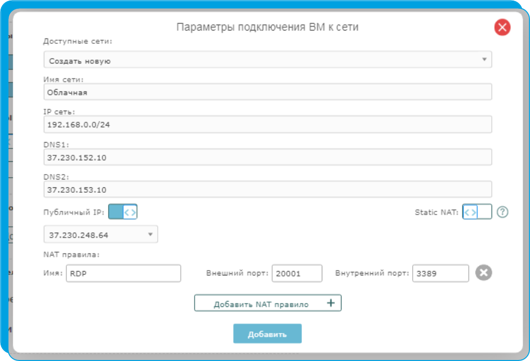 2. В появившемся окне "Параметры подключения ВМ к сети" в выпадающем списке "Доступные сети" выберите "Создать новую"
