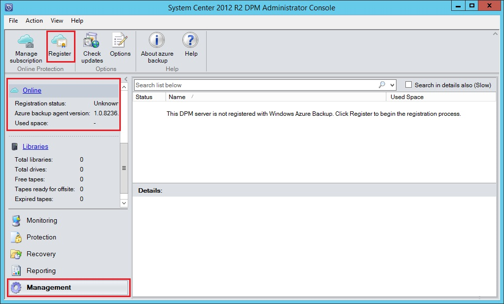 Далее в SC DPM зарегистрируйте Ваш Azure Backup. Для этого в разделе "Management" нажмите "Online" и затем нажмите кнопку "Register".