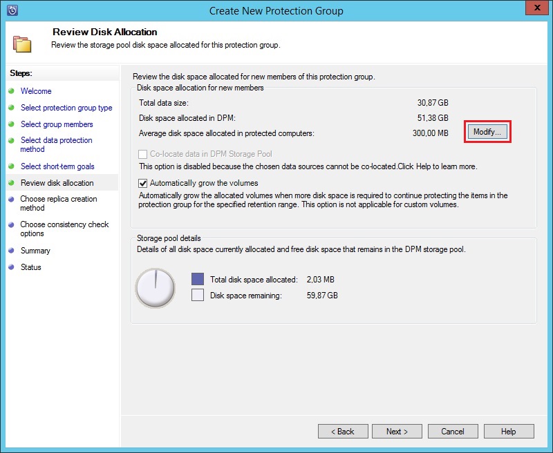 Дисковое пространство, выделяемое под резервное копирование данных, задается как автоматически, так и вручную. Чтобы выделить дисковое пространство вручную, нужно нажать кнопку "Modify" в разделе "Review Disk Allocation"