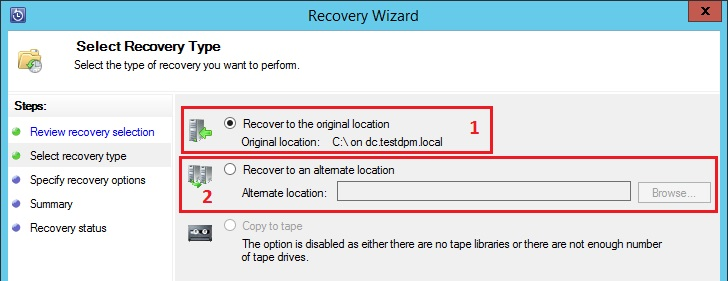 Данные можно восстановить в исходное место (пункт 1) либо в любое другое (пункт 2)