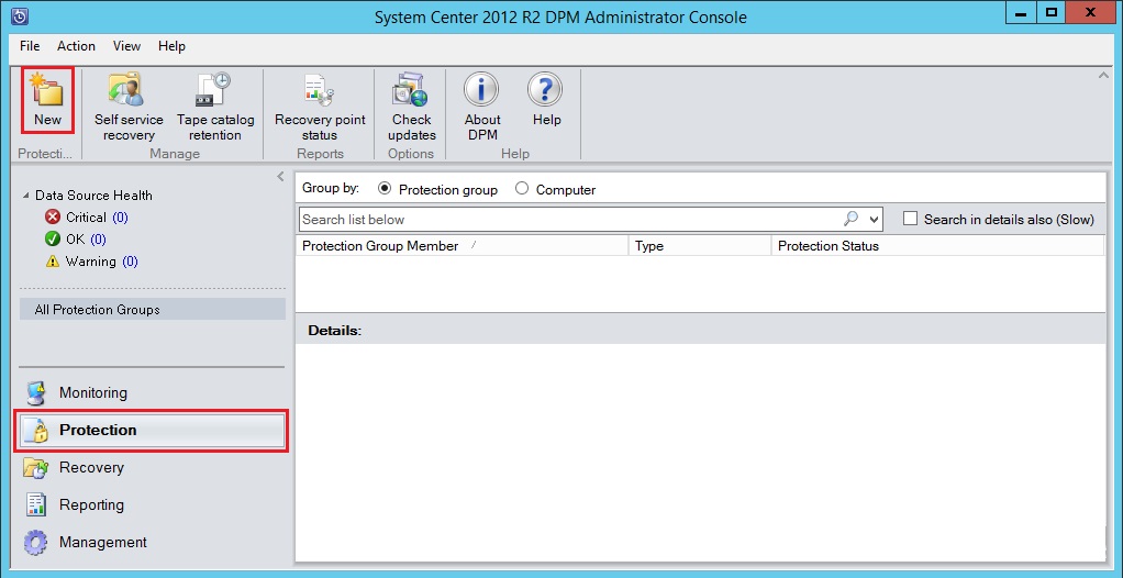 Для настройки резервного копирования на локальный диск нужно создать группу защиты (Protection Group) в разделе "Protection", нажав кнопку "New"