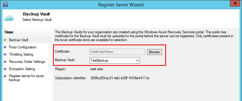 При регистрации сервера Azure Backup в SC DPM нужно указать тот же сертификат, что и загружали в портале, после чего выбрать хранилище.