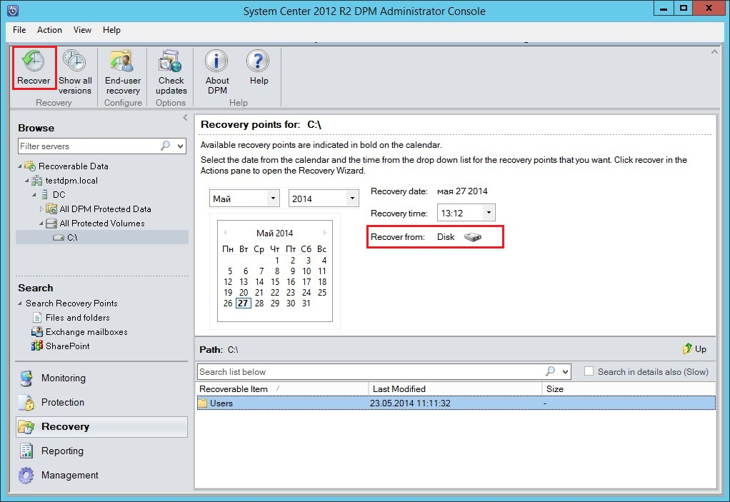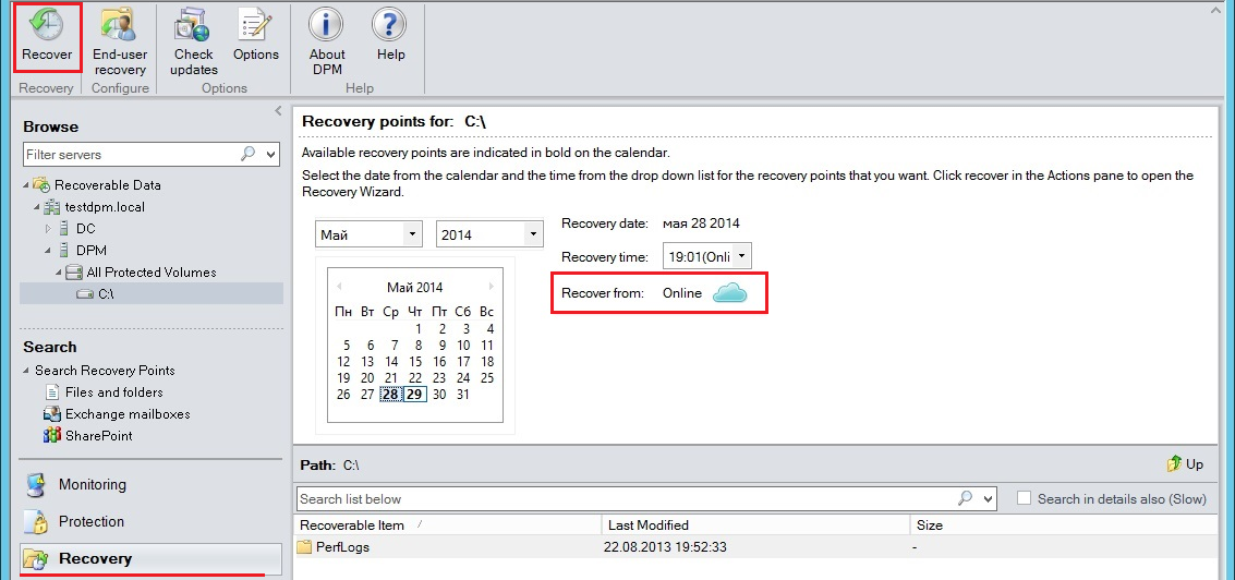 Процедура восстановления с Azure Backup аналогична восстановлению с диска. Для выполнения восстановления данных перейдите в раздел "Recovery", найдите нужную Вам запись и нажмите кнопку "Recover". Данные, хранящиеся в Azure Backup, будут отмечены как "Online"