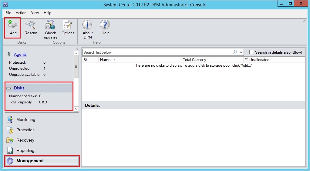 Подключение локального диска в SC DPM 2012 осуществляется в консоли DPM, в разделе "Management". В верхнем меню нажмите кнопку кнопку "Add".