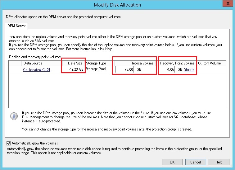 В поле "Data Size" отображается размер уже использованного дискового пространства под данные, в поле "Replica Volume" - общий размер выделенного дискового пространства под данные, в поле "Recovery Point Volume" - выделенное дисковое пространство из "Replica Volume" для хранения точек восстановления.