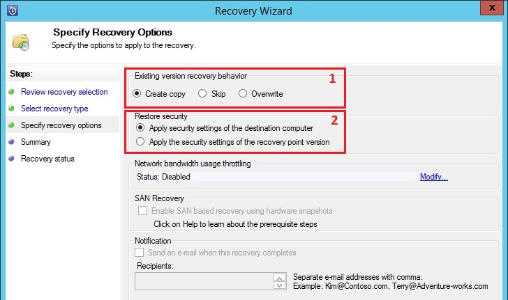 Укажите что делать с данными, если обнаружатся файлы с такими же именами (пункт 1) и какие настройки безопасности для данных использовать (пункт 2)