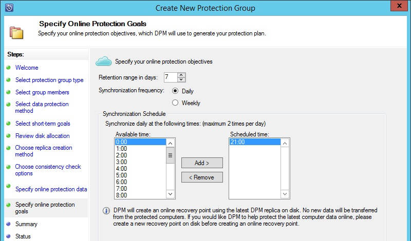 Также для онлайн копирования можно настроить глубину архивации (за какой промежуток времени будут хранится данные) и расписание синхронизации