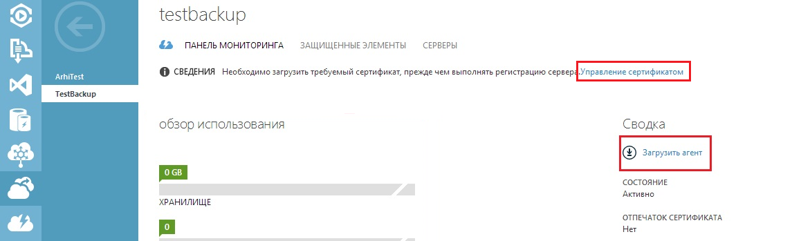 Для подключения Azure Backup в SC DPM предварительно необходимо установить приложение-агент Azure Backup и установить сертификат.