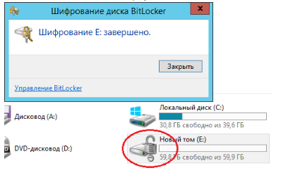 После того как шифрование данных выполнено Вы получите соответствующее сообщение и в проводнике на диске появится значок в форме замка