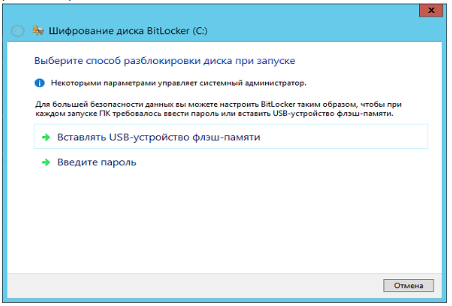 Выберите способ разблокировки диска С: - в первом случае ключ шифрования будет храниться на сменном USB-носителе, что не удобно для использования в облаках. Поэтому используем парольный метод разблокировки.