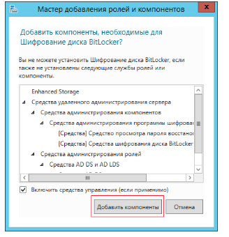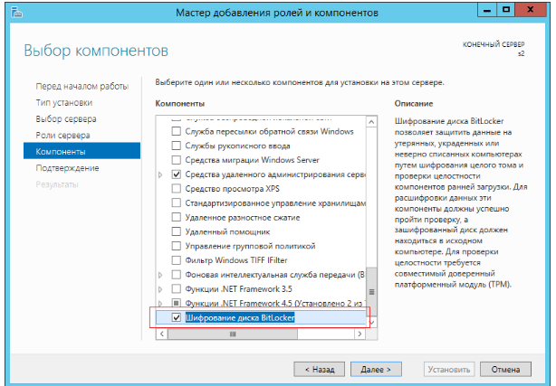В качестве дополнительного инструмента зашиты информации можно использовать шифрование данных. Microsoft предлагает использовать в качестве инструмента шифрования - Bitlocker. Эта утилита является встроенной в ОС. Для установки на сервер необходимо через диспетчер сервера установить дополнительный компонент "Шифрование диска Bitlocker"