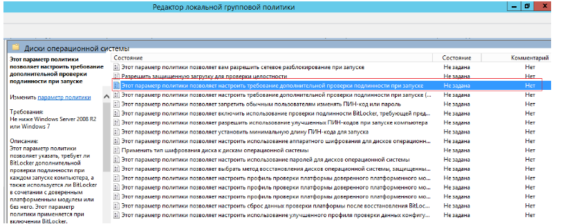 После установки, необходимо в редакторе локальной политики безопасности включить параметр дополнительной проверки подлинности при запуске. Параметр находится в ветке Параметры компьютера-Административные шаблоны-Компоненты Windows-Этот параметр позволяет выбрать шифрование диска Bitlocker-Диски операционной системы