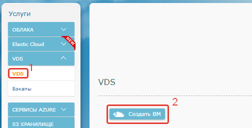 1. В разделе "Услуги" портала cp.oblakoteka.ru кликните по строке "VDS", затем "Создать ВМ":