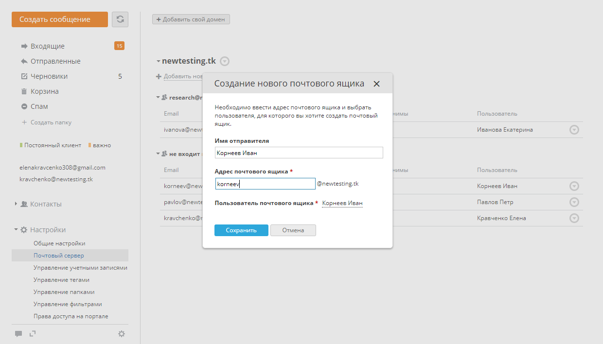 Чтобы создать новый почтовый ящик: