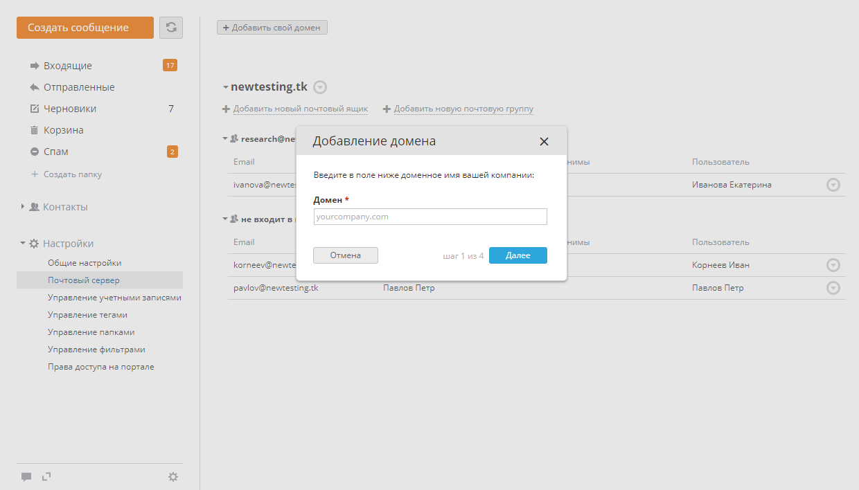 Примечание: Для одного пользователя можно создать только два почтовых ящика в каждом домене.