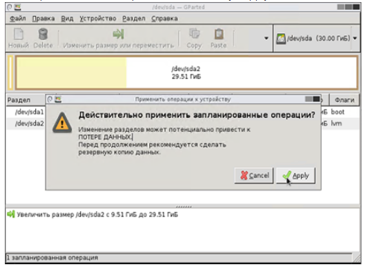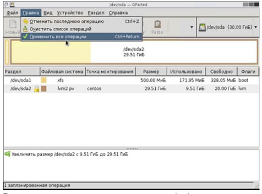 Мы выполнили с помощью утилиты gparted увеличение физического раздела. Для того чтобы ОС увидела новый размер и изменения примерились нужно увеличить размер логического тома и файловой системы.