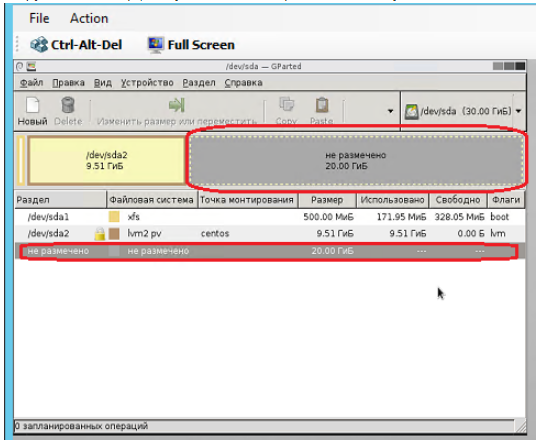 В инструкции приведен пример увеличение размера раздела для ВМ созданной из стандартного шаблона CentOS 7.0 x64 с размером диска 30Гб.