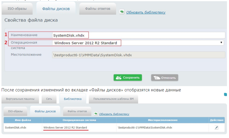 Файл диска можно использовать и для замены/добавления диска в существующей ВМ, так и для создания шаблона ВМ. В случае использование для замены/добавления, поле «Операционная система» служит в качестве информационного. Для создания шаблона ВМ это поле надо задать (необходимо указать редакцию ОС на этом диске). Для изменения поля «Операционная система» нужно в поле диска нажать кнопку «Изменить» (см. рисунок ниже, кнопка 2).