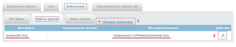 Для того чтобы использовать собственный диск, его нужно загрузить на FTP-сервер облака в папку VMMData. Все подгруженные диски отображаются в панели управления в разделе «Библиотека» во вкладке «Файлы дисков». Если после загрузки диск не появился в списке дисков, тогда нужно обновить библиотеку, нажав соответствующую кнопку (см. рисунок ниже, кнопка 1).