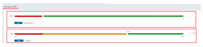 Затем в разделе «Ресурсы ВМ», выберите необходимые ресурсы, vCPU – 1 и RAM – 4 Гб: