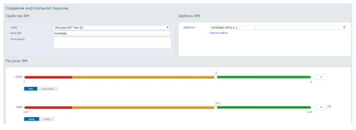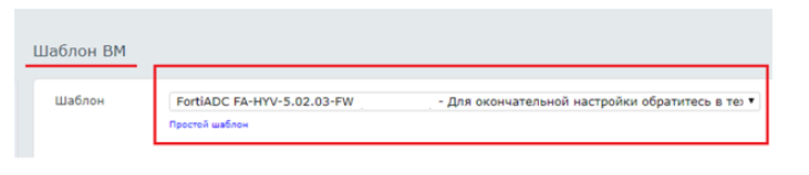 Для создания указанной ВМ, в СР выберете из списка общедоступных шаблонов, шаблон – «FortiADC FA-HYV-5.02.03-FW»
