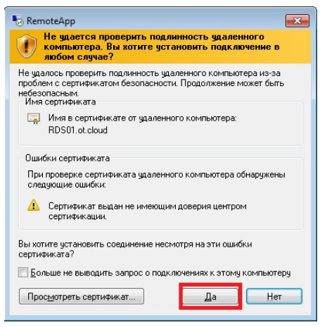 Затем согласиться с предупреждением о сертификате, нажав кнопку «Да»:
