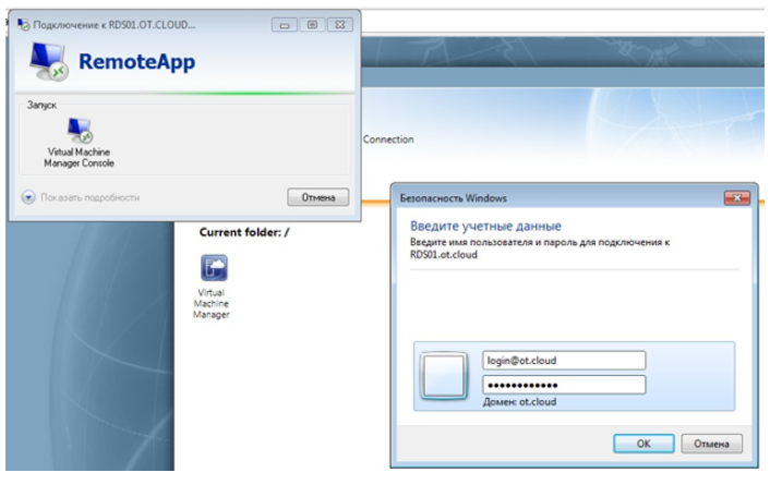 Далее необходимо запустить скачанный RDP-файл, и в появившемся окне авторизации снова указать логин и пароль из вкладки "Управление облаком".