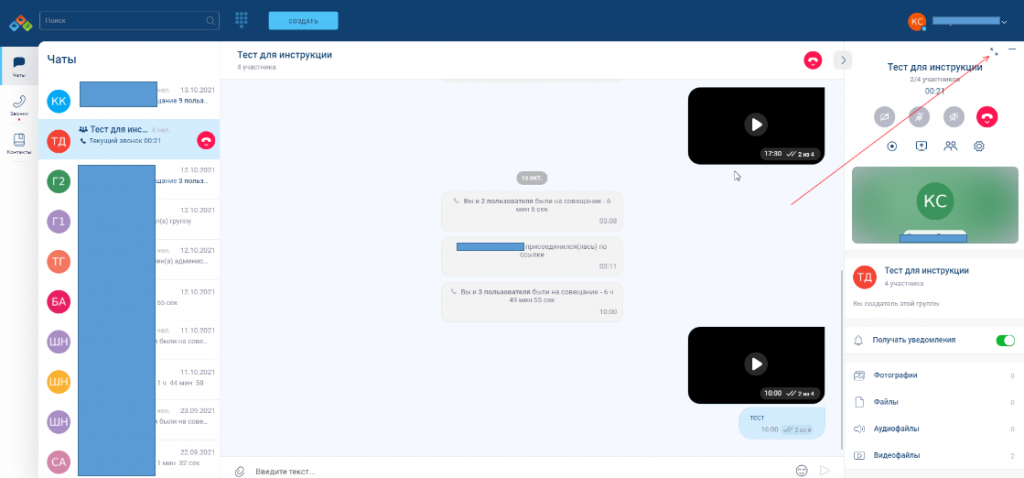 Для перехода в полноэкранный режим необходимо во время звонка необходимо на верхней панели звонка нажать на значок двух стрелок или же на правой боковой панели