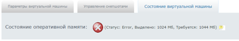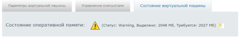 Если Вы видите предупреждение в виде восклицательного знака в параметрах виртуальной машины, в закладке «Состояние виртуальной машины», в поле «Состояние оперативной памяти»