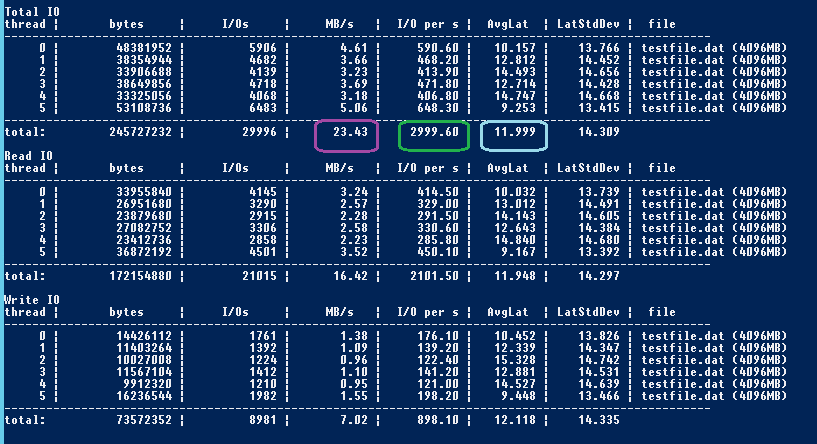 Здесь мы видим, что производительность нашего диска составляет 2999,60 операций ввода-вывода в секунду (I/O per sec) со средней пропускной способностью 23,43 Мб/с (MB/s) и с 11,999 миллисекундами средней задержки (AvgLat).